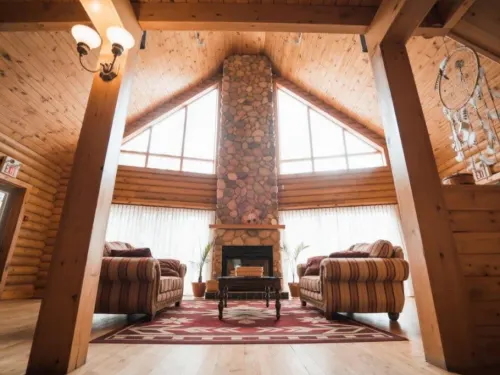 Enjoy a rustic Indigenous-inspired meal around the stone fireplace at the main salon. Spend the night in one of our queen rooms with access to a wrap-around deck.